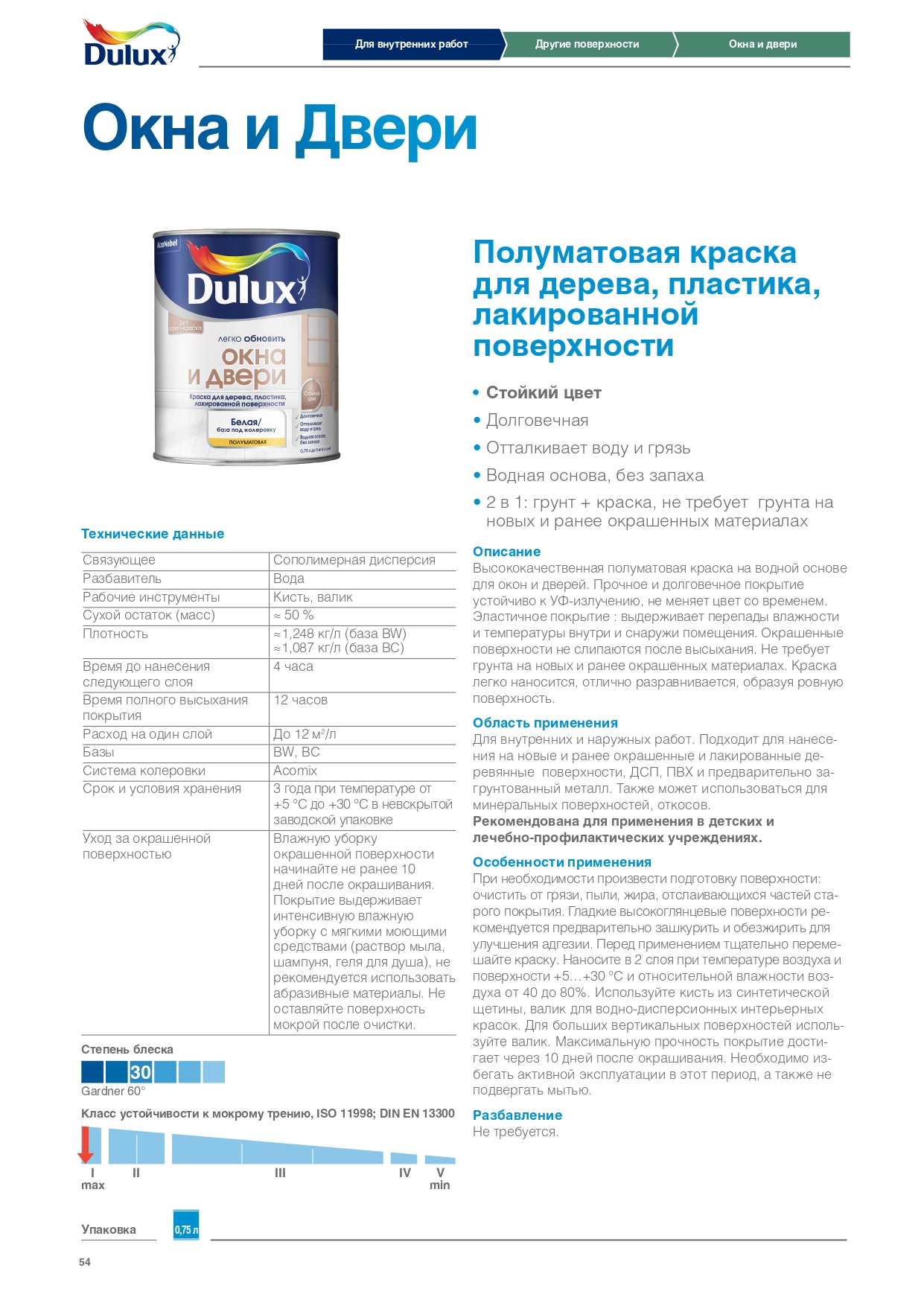 Высококачественная полуматовая краска на водной основе для окон и дверей. Прочное и долговечное покрытие устойчиво к УФ-излучению, не меняет цвет со временем. Эластичное покрытие: выдерживает перепады влажности и температуры внутри и снаружи помещения. Окрашенные поверхности не слипаются после высыхания. Не требует грунта на новых и ранее окрашенных материалах. Краска легко наносится, отлично разравнивается, образуя ровную поверхность.