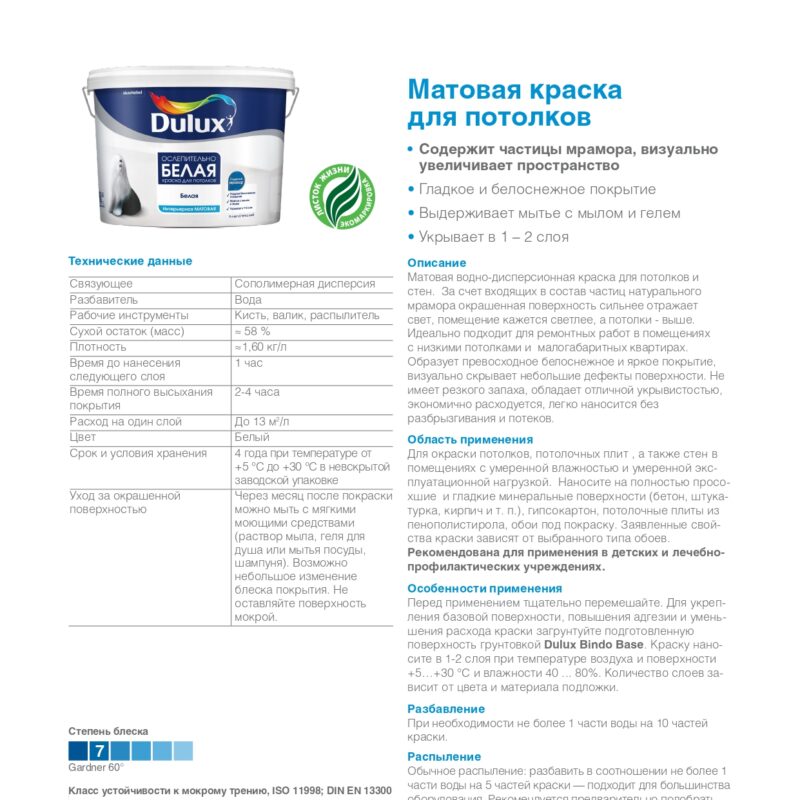 Латексная краска для создания матовых покрытий на стенах и потолках. Формирует прочное покрытие. Подходит для стен помещений с умеренной эксплуатационной нагрузкой, таких как спальни, гостиные, кабинеты, гардеробные. Оптимальна для нанесения на рельефные обои. Рекомендована для применения в учреждениях здравоохранения, детских и дошкольных учреждениях.