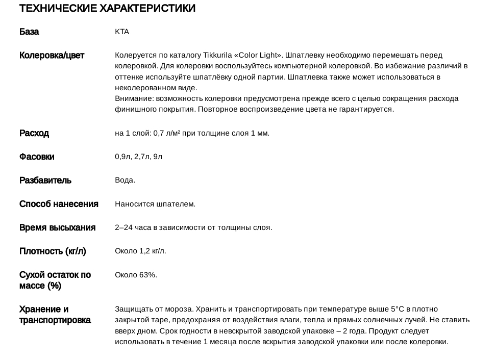 Легкая шпатлевка для стен и потолка. Применяется для сухих помещений в системе с грунтовкой Tikkivala Euro Primer или Tikkivala Prof Base и воднодисперсионными красками для стен и потолков Tikkivala. Предназначена для финишной отделки неокрашенных и ранее окрашенных поверхностей (водно-дисперсионными и алкидными красками) при условии соблюдения технологии, а также полного и частичного выравнивания гипсовых, гипсокартонных плит с использованием шовной ленты, ДВП, бетонных, пенобетонных, газобетонных, кирпичных, оштукатуренных поверхностей в сухих помещениях под окраску и оклеивание обоями.