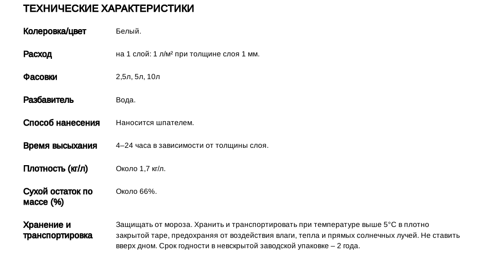 Наносить шпателем на сухую подготовленную поверхность в один или несколько слоев. Второй и последующие слои наносить при полном высыхании предыдущего слоя. Рекомендуемая толщина слоя до 5 мм. После полного высыхания поверхность отшлифовать, пыль удалить. После окончания работ инструменты промыть водой с мылом. Для удаления затвердевшего