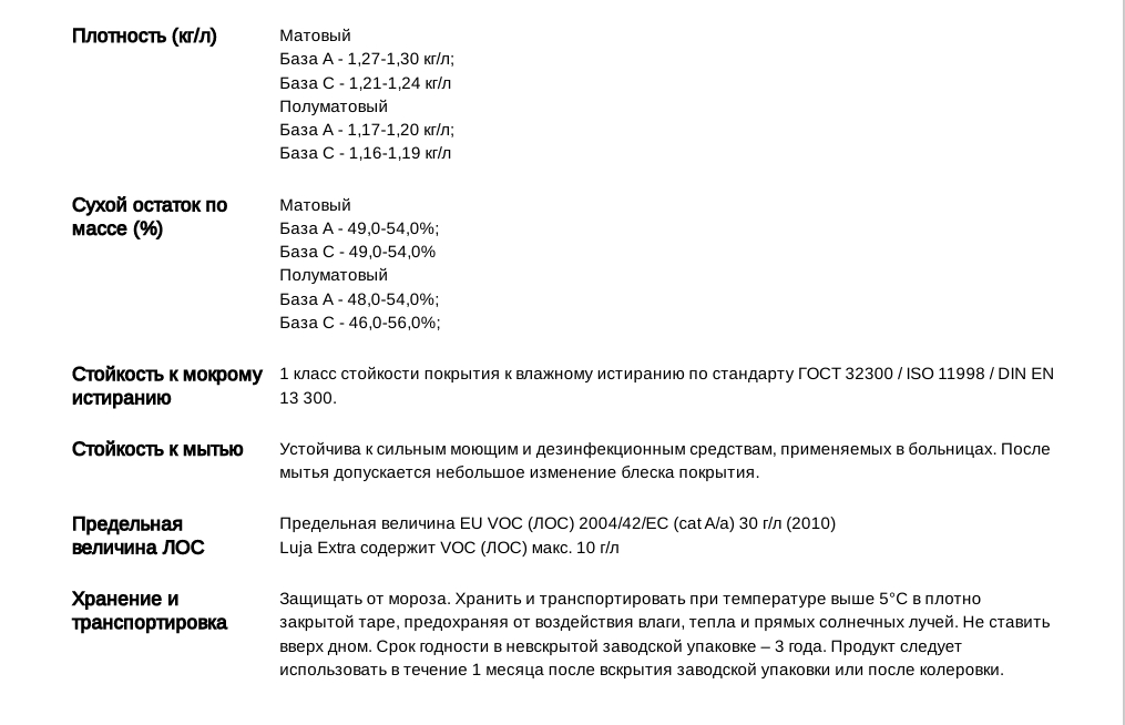 мыть, не оставляя подтеков и разводов, большими участками сверху вниз с равномерным усилием, пока не будет очищена вся стена. Стойкость покрытия к мытью гарантирует сохранение защитных свойств покрытия, так как слой краски не истирается при мытье, но шероховатости поверхности могут сглаживаться от истирающего воздействия, из-за чего поверхность матового покрытия может начать лосниться в отдельных местах. При предполагаемой высокой эксплуатационной нагрузке покрытия (высокая устойчивость к загрязнениям и воздействию воды) рекомендуется использовать Luja Extra полуматовая или другие водно-дисперсионные краски с полуматовой степенью блеска и выше.